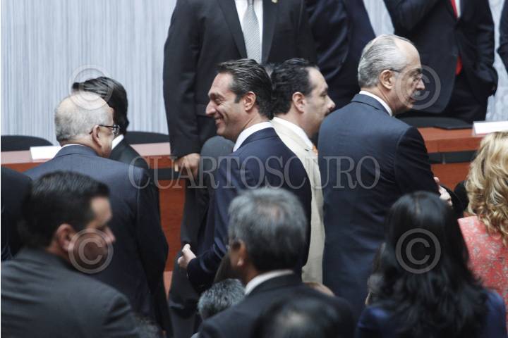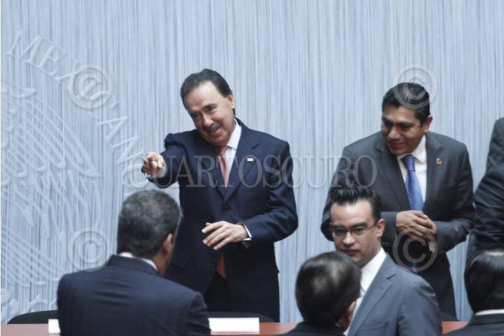 MÉXICO, D.F., 14JULIO2014.- Los coordinadores parlamentarios en el Senado, Emilio Gamboa Patrón, del PRI, y Jorge Luis Preciado, del PAN, durante la promulgación de la Ley Federal de Telecomunicaciones y Radiodifusión en el Palacio Nacional. FOTO: ISAAC ESQUIVEL /CUARTOSCURO.COM