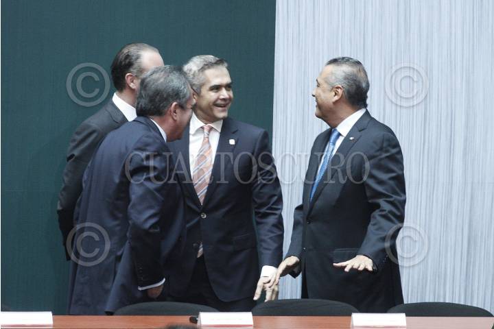 MÉXICO, D.F., 14JULIO2014.- Carlos Lozano, gobernador de Aguascalientes, Miguel Ángel Mancera, jefe de Gobierno del D.F., y Manlio Fabio Beltrones, coordinador parlamentario del PRI en la Cámara de Diputados, durante la promulgación de la Ley Federal de Telecomunicaciones y Radiodifusión en el Palacio Nacional. FOTO: ISAAC ESQUIVEL /CUARTOSCURO.COM