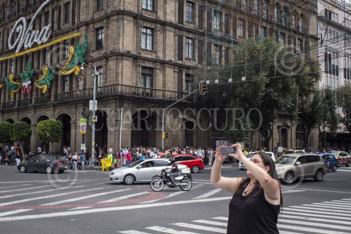 MEXICO, D.F., 06SEPTIEMBRE2014.- Una mujer se detiene a media calle para tomar una foto de los adornos alusivos al aniversario de la Independencia, instalados en los edificios aledaños al zócalo capitalino. FOTO: DAVID POLO /CUARTOSCURO.COM
