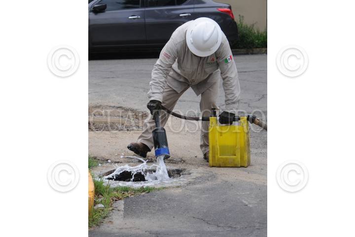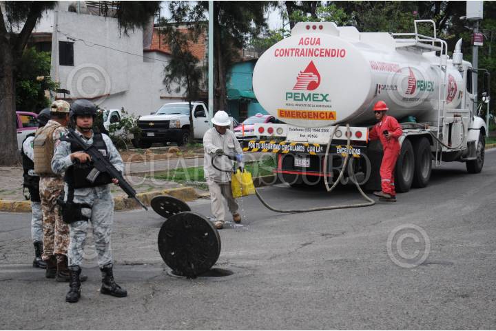 CIUDAD DE MÉXICO, 24JULIO2024.- Un trabajador de Pemex vierte agua contraindencios en una de las coladeras donde se detectó la filtración de hidrocarburo. FOTO: DANIEL AUGUSTO /CUARTOSCURO.COM