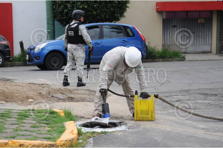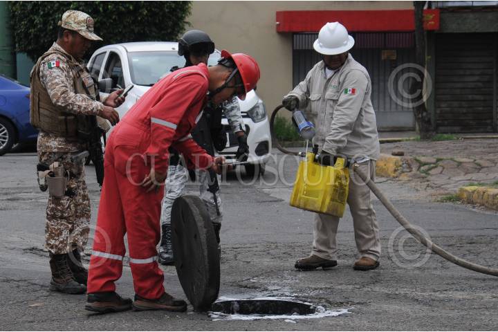CIUDAD DE MÉXICO, 24JULIO2024. - Luego de denuncias por parte de vecinos de la Alcaldía GAM, además de un incendio provocado por una toma clandestina en las inmediaciones del AICM, elementos de la Guardia Nacional, Pemex y trabajadores de la paraestatal, se han dedicado a limpiar las tuberías y coladeras donde se haya detectado la presencia de hidrocarburo. FOTO: DANIEL AUGUSTO /CUARTOSCURO.COM