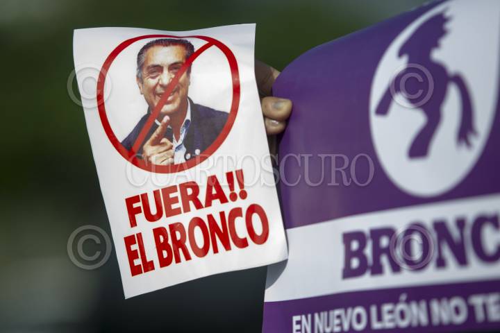 MONTERREY, NUEVO LEÓN, 06ABRIL2018.- Miembros del Congreso Nacional Ciudadano protestan en contra del gobernador independiente con licencia Jaime Rodríguez Calderón "El Bronco" colocando calcas en automóviles con la leyenda "Fuera el Bronco" manifestando rechazo a su regreso a Nuevo León al no ser aceptado por el INE a aparecer en las boletas de las elecciones 2018 y contender por la presidencia de México. El TRIFE espera la impugnación realizada por los representantes de Rodríguez Calderón sobre la negativa del registro del INE y emitir un resultado. FOTO: GABRIELA PÉREZ MONTIEL /CUARTOSCURO.COM