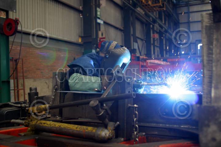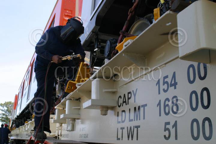 Ciudad Sahagun, Hidalgo, 13 JULIO 2004.- Un trabajador labora en la construcción del nuevo tren que se utilizarán en la linea 2 del metro de la Ciudad de México, la entrega de los 45 trenes se concluirá a mediados del 2005. FOTO: Sandra Perdomo/CUARTOSCURO.COM