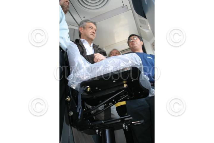 Ciudad Sahagun, Hidalgo, 13 JULIO 2004.- Andrés Manuel López Obrador, jefe de Gobierno del D.F. entró a la cabina de control de nuevo tren construido por la empresa Bombardier Transportation. FOTO: Sandra Perdomo/CUARTOSCURO.COM