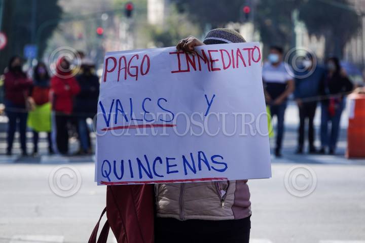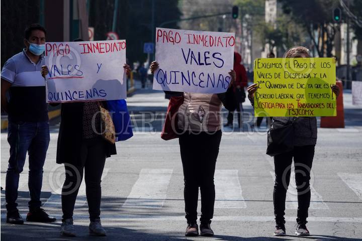 Trabajadoras del TSJCDMX sostienen pancartas exigiendo el pago de vales y quincenas.