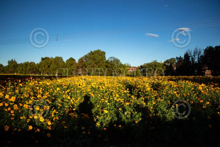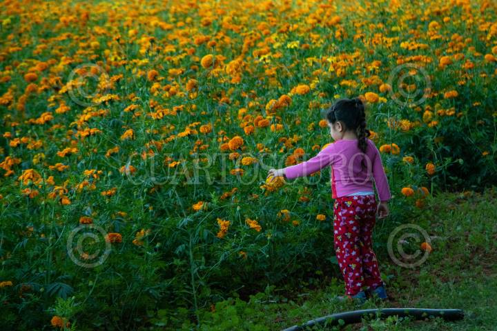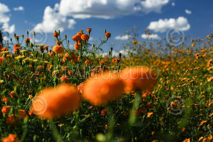 Pequeños productores en el municipio cuidan sus parcelas de flor de cempasúchil que sembraron para cosechar en días próximos y así poder vender en panteones y mercados del municipio.