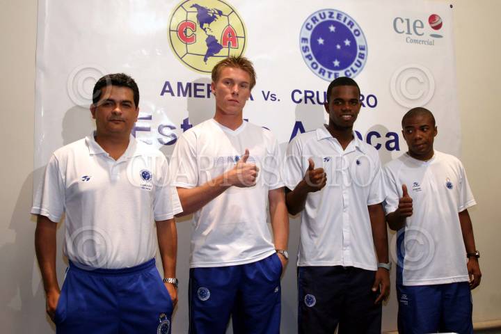 México, D.F., 07AGOSTO2004.- El equipo brasileño de futbol Cruzeiro, se presentó en una rueda de prensa previo a su partido amistoso con el América. En la imagen, Ney Franco de Oliveira Junior, director técnico, Aloisio Carlos de Oliveira, portero, José Tadeu Mouro Junior, delantero y Marco Aurelio Barbosa, lateral, son parte del equipo que mañana enfrentará a las Aguilas en el festejo del Día del Aficionado. FOTO: Moisés Pablo/CUARTOSCURO.COM