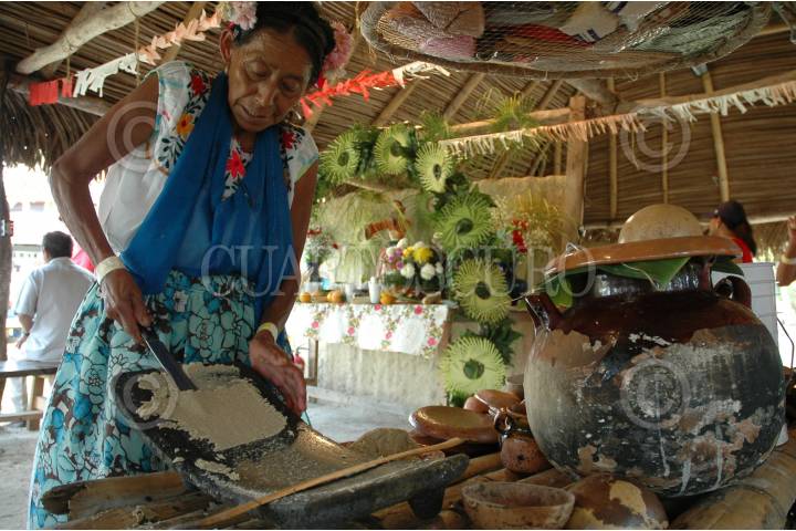 PAPANTLA, VERACRUZ, 21MARZO2009.- Una mujer indigena prepara tostadas a base de masa de nixtamal preparada tradicionalmente como en sus comunidades totonacas, esto dentro de las actividades de Cumbre Tajín 2009 que se realiza en el parque temático Takilhsukut del 18 al 22 de marzo. FOTO: RODOLFO ANGULO/CUARTOSCURO.COM