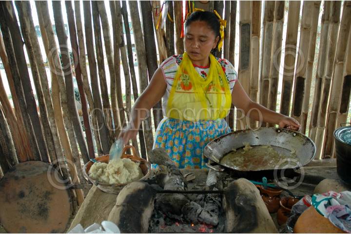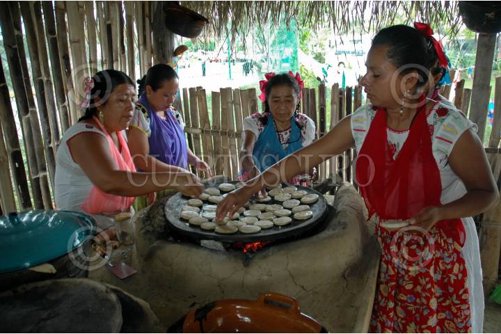 PAPANTLA, VERACRUZ, 21MARZO2009.- Mujeres indigenas preparan la comida al estilo tradicional de sus comunidades totonacas dentro del nicho de aromas y sabores para la degustación de los asistentes a Cumbre Tajín 2009 y que se realiza en el parque temático Takilhsukut del 18 al 22 de marzo. FOTO: RODOLFO ANGULO/CUARTOSCURO.COM