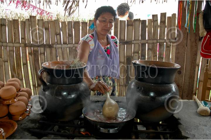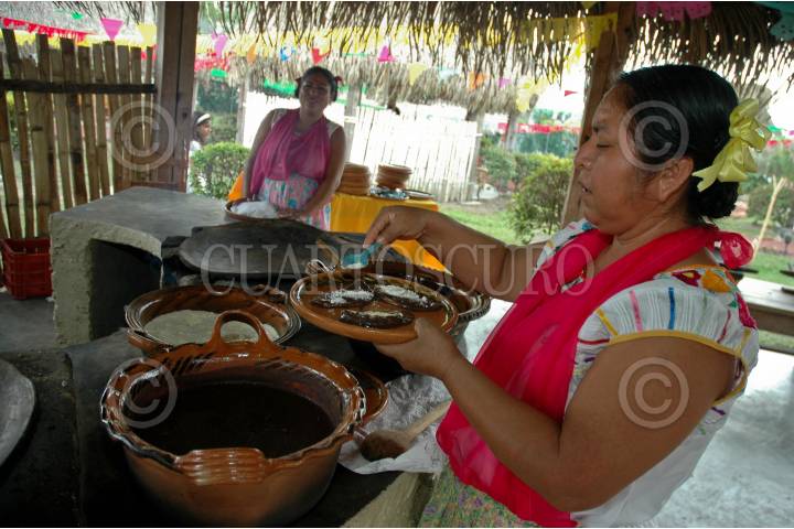 PAPANTLA, VERACRUZ, 21MARZO2009.- Mujeres indigenas preparan té de manzanilla, atole y café al estilo tradicional de sus comunidades totonacas dentro del nicho de aromas y sabores para la degustación de los asistentes a Cumbre Tajín 2009 y que se realiza en el parque temático Takilhsukut del 18 al 22 de marzo. FOTO: RODOLFO ANGULO/CUARTOSCURO.COM