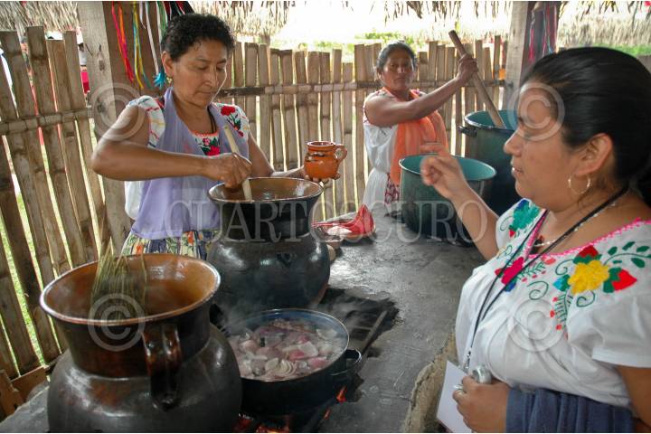 PAPANTLA, VERACRUZ, 20MARZO2009.- Mujeres indígenas preparan la comida al estilo tradicional de sus comunidades totonacas dentro del nicho de aromas y sabores para la degustación de los asistentes a Cumbre Tajín 2009 y que se realiza en el parque temático Takilhsukut del 18 al 22 de marzo. FOTO: RODOLFO ANGULO/CUARTOSCURO.COM