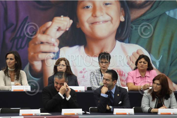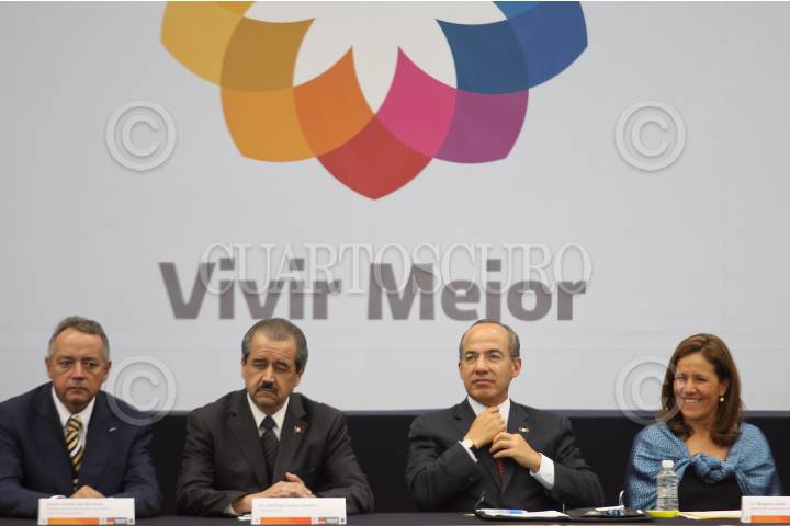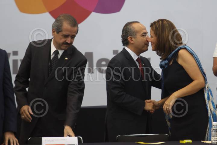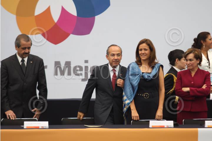 MÉXICO, D.F., 25JUNIO2010.- El senador Ernesto Saro, José Ángel Cordoba Villalobos, secretario de Salud, el presidente Felipe Calderón y su esposa Margarita Zavala durante el evento de conclusiones de los foros regionales: "Hacia un modelo integral para la prevención y atención de las adicciones" que se realizo en el Centro Nacional de Desarrollo de Talentos Deportivos y Alto Rendimiento. FOTO: RODOLFO ANGULO/CUARTOSCURO.COM