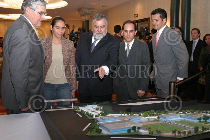 MEXICO, D.F., 24AGOSTO2005.- Nelson Vargas, director de la CONADE, Dione Anguiano, directora del deporte en el DF, Alejandro Encinas, jefe de gobierno y Carlos Hermosillo, ex-futbolista, checan la maqueta del Centro Nacional de Desarrollo de Talentos Deportivos y de Alto Rendimiento, en un hotel del Centro Histórico. FOTO: Moisés Pablo/CUARTOSCURO.COM