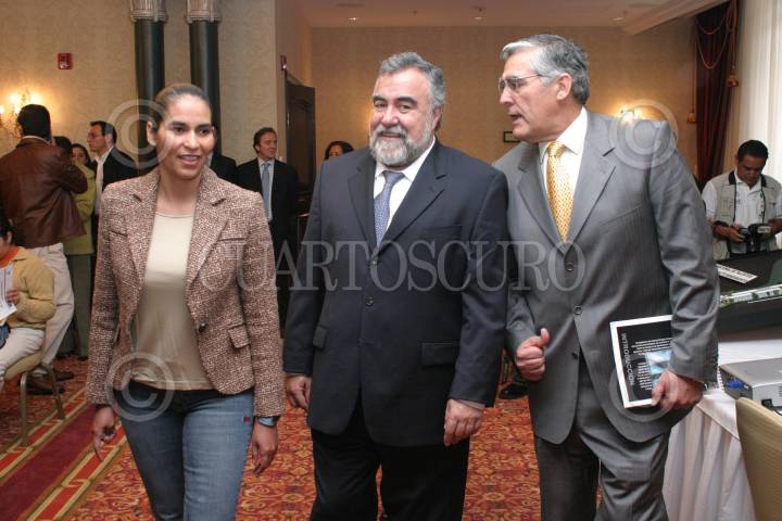 MEXICO, D.F., 24AGOSTO2005.-Dione Anguiano, directora del deporte en el DF, Alejandro Encinas, jefe de gobierno y Nelson Vargas, director de la CONADE, durante la presentación de avances del Centro Nacional de Desarrollo de Talentos Deportivos y de Alto Rendimiento, en un hotel del Centro Histórico. FOTO: Moisés Pablo/CUARTOSCURO.COM