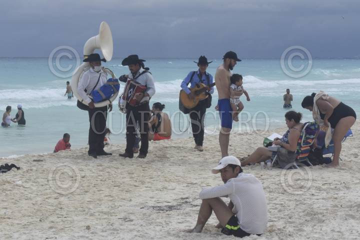 Un grupo de músicos camina en la playa buscando amenizar los turistas que disfrutan de la playa.