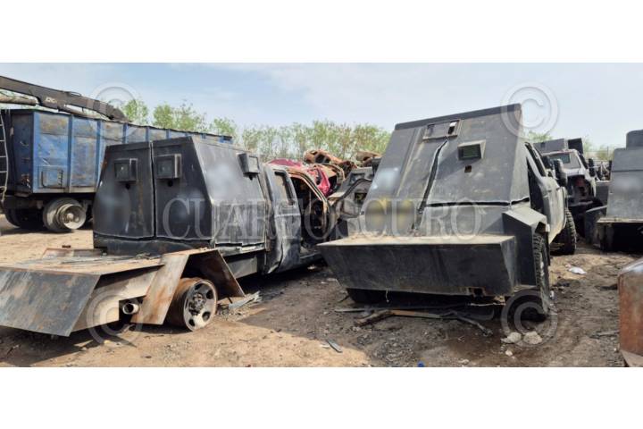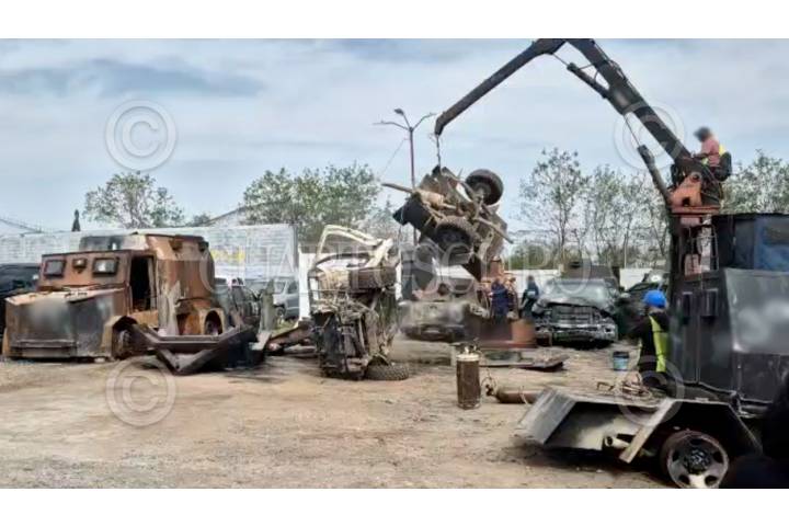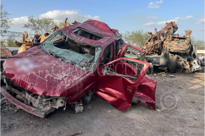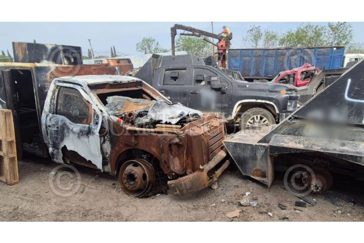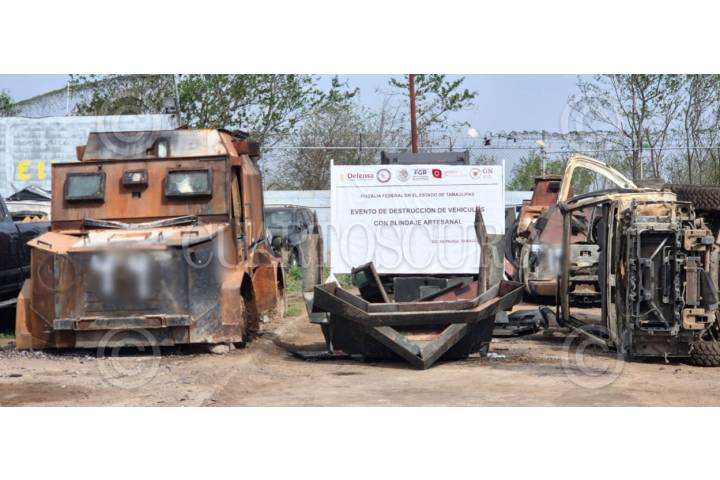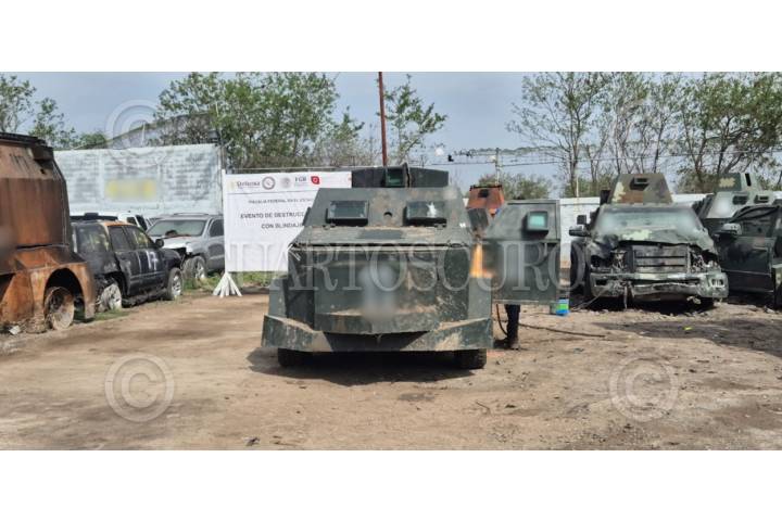 REYNOSA, TAMAULIPAS, 23MARZO2025.- La Fiscalía General de la República (FGR), a través de su Fiscalía Especializada de Control Regional (FECOR) en Tamaulipas, en cumplimiento al Programa Destino de Bienes y Objetos del Delito, destruyó 45 vehículos de los denominados “monstruos”, con blindaje artesanal. El evento se llevó a cabo en las instalaciones de la Fiscalía Federal de Tamaulipas, ubicada en Reynosa, los vehículos destruidos están relacionados con 19 expedientes, los cuales fueron asegurados en diversos enfrentamientos en dicha entidad y presuntamente fueron utilizados por personas pertenecientes a grupos delictivos. En el desarrollo de las diligencias se contó con la presencia del Ministerio Público Federal (MPF), quien coordinó el evento de identificación y realizó las diligencias, así como peritos oficiales y personal del Órgano Interno de Control de la FGR, quienes verificaron que el procedimiento se llevara a cabo en los términos de la norma aplicable. FOTO: FGR/CUARTOSCURO.COM