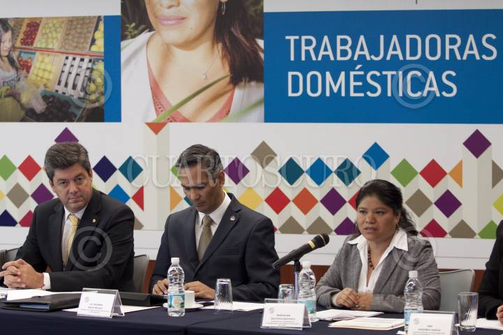 MÉXICO, D.F., 22NOVIEMBRE2011.- Guillermo Tamborrel Suárez, presidente de la comisión de Salud del Senado, Ricardo Bucia Mújica, presidente del Consejo Nacional para prevenir la Discriminación, y Marcelina Bautista Bautista, secretaria general de la Confederación Latinoamericana y del Caribe de Trabajadoras del Hogar, durante la presentación de la Encuesta Nacional sobre Discriminación en México "Trabajadoras Domésticas", en el Senado de la República. FOTO: MOISÉS PABLO/CUARTOSCURO.COM