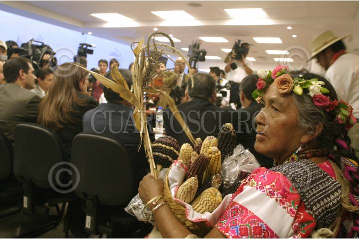 MEXICO, D.F., 12MARZO2008.- El movimiento "Sin Maiz No Hay Pais, Sin Frijol Tampoco" asistieron a las afueras del Senado de la República para entregar a legisladores más de medio millon de firmas y exigir la renegocioacion del apartado agricola del Tratado de Libre Comercio de America del Norte. FOTO: SAÚL LÓPEZ/CUARTOSCURO.COM