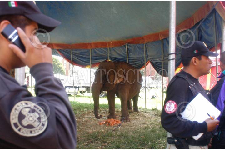 MÉXICO D.F., 24JULIO2009.- Las elefantas Ana y Tania de 12 y 18 años respectivamente provocaron una intensa movilización policiaca, al soltarse de sus amarras que las sostenian en el predio donde habitan, las elefantas son propiedad del circo Unión ubicado en prolongación División del Norte FOTO:LUIS CARBAYO/CUARTOSCURO.COM
