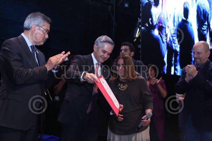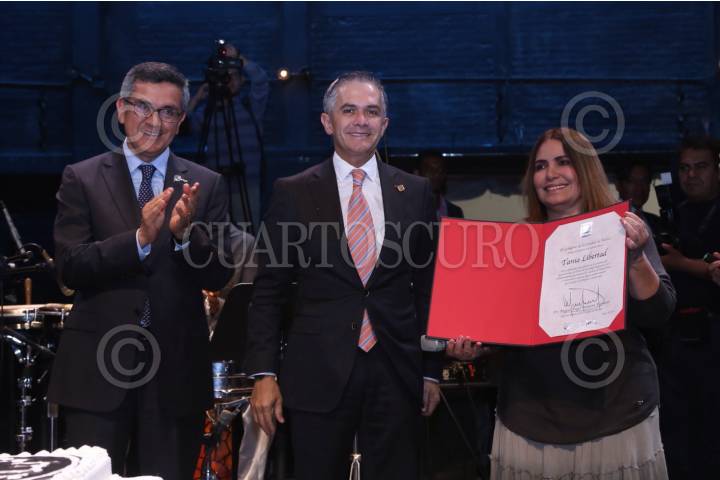 CIUDAD DE MÉXICO, 26MAYO2017.- Miguel Ángel Mancera, jefe de Gobierno, y la cantante Tania Liberta en la celebración del 99 aniversario del Teatro de la Ciudad “Esperanza Iris”. El Jefe de Gobierno agradeció y reconoció su labor por hacer posible que siga funcionando el espacio construido a inicios del siglo XX y que fuera inaugurado el 25 de mayo de 1918. FOTO: CORTESÍA CDMX /CUARTOSCURO.COM