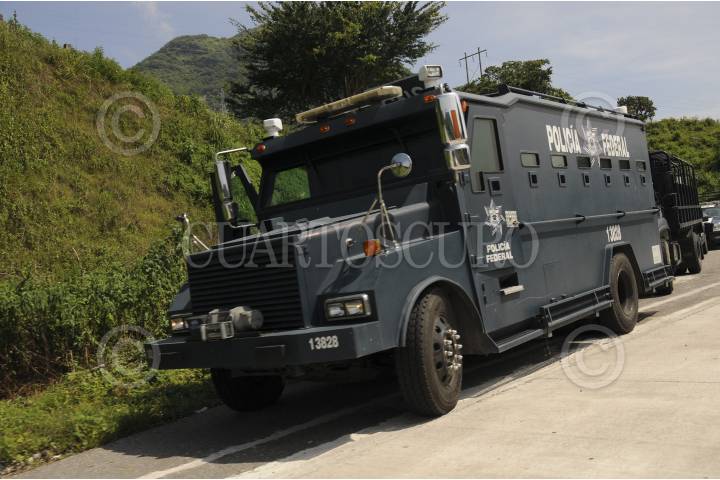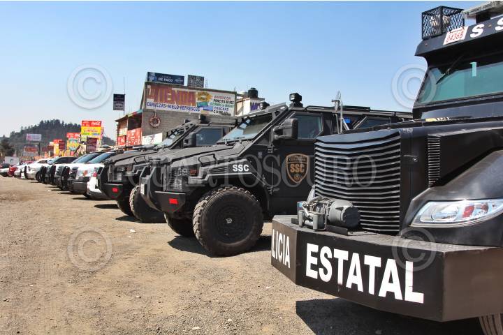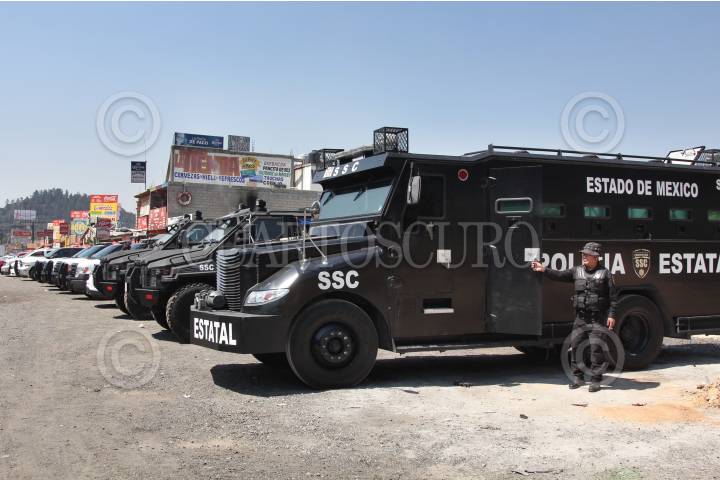 OCOYOACAC, EDOMEX, 18FEBRERO2014.- Tanquetas de la Secretaria de Seguridad Ciudadana mantienen un retén permanente con elementos antimotines en el entronque de la autopista y carretera federal México-Toluca, como parte del operativo de seguridad por la cumbre de los líderes del norte. FOTO: SAÚL LÓPEZ /CUARTOSCURO.COM