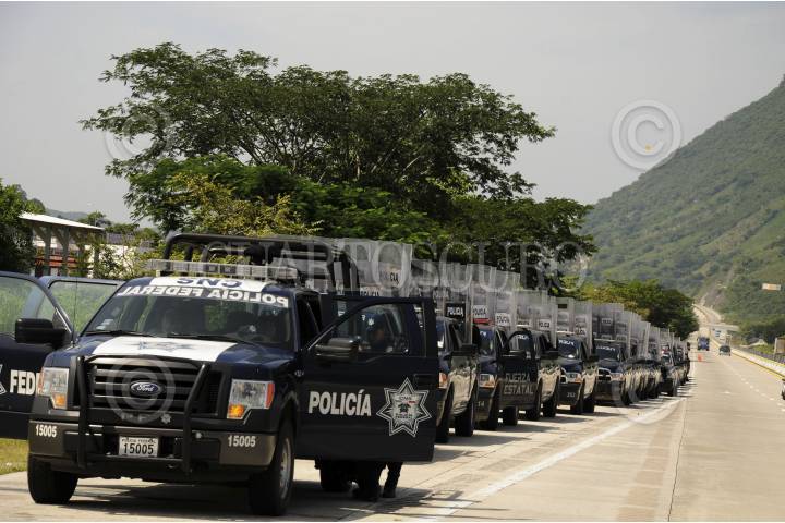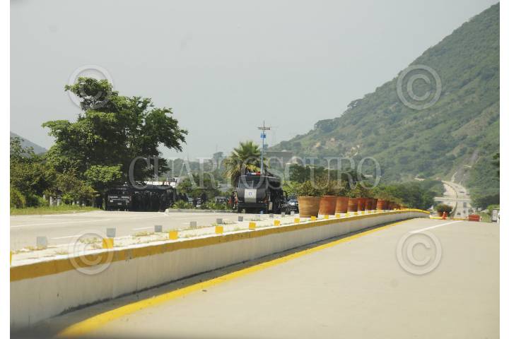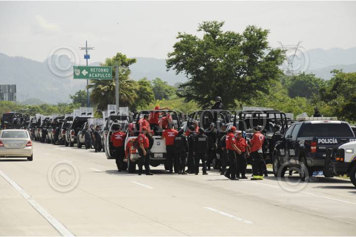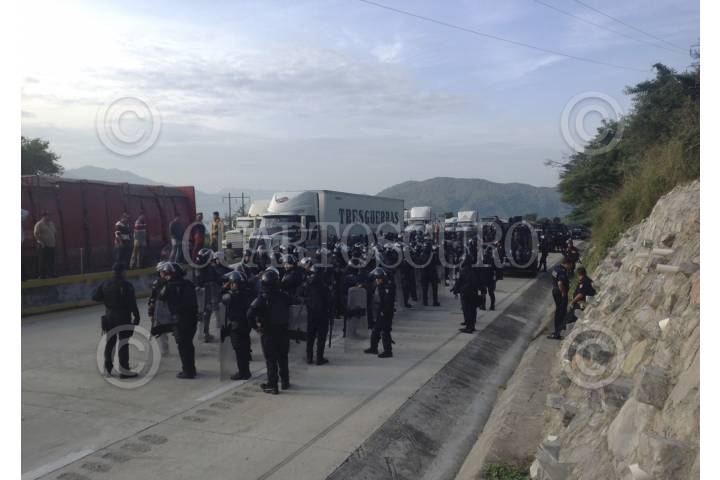 CHILPANCINGO, GUERRERO, 08AGOSTO2014.- Ciudadanos que simpatizan con la Unión de Pueblos y Organizaciones Sociales del Estado de Guerrero (UPOEG) que bloquearon en punto de la 5 de la tarde el crucero de Ayutla en Tierra Colorada jueves 7 del mes en curso, el mismo día pero horas después iniciaron a bloquear el punto conocido como Mojoneras de Chilpancingo en la carretera federal municipio y la autopista del Sol, trascendió que inicio el bloqueo en estos puntos a las 11 de la noche del jueves y duro el resto de la noche, hasta las diez y media de la mañana del viernes. Durante la mañana cientos de agentes federales y estatales llegaron hasta el lugar de los hechos con equipo antimotines, esperando la orden de desalojo de los bloqueadores de las vías, quienes después de un dialogo liberaron la arteria vehicular. FOTO: JOSÉ I. HERNÁNDEZ /CUARTOSCURO.COM
