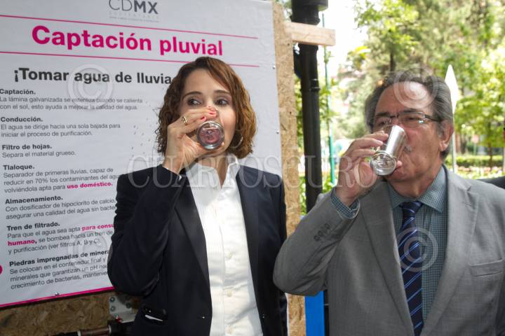 CIUDAD DE MÉXICO, 05JULIO2017.- Ricardo Núñez Muñoz, embajador de Chile, y Tanya Müller, secretaria de Medio Ambiente de la capital, beben agua potable que fue captada por un sistema de aguas pluviales y de purificación, que se encuentra instalado en el Pabellón Hidríco, en la colonia Polanco. FOTO: MOISÉS PABLO /CUARTOSCURO.COM