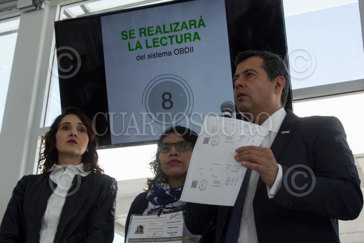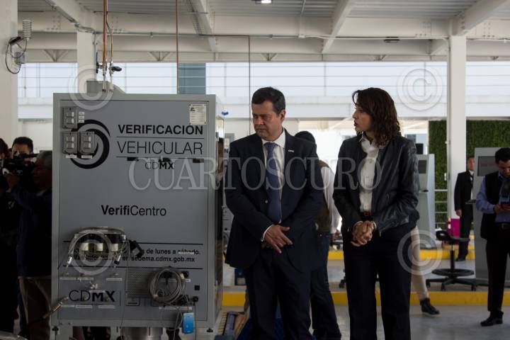 CIUDAD DE MÉXICO, 07JUNIO2018.- José Ramón Amieva, jefe de gobierno de la Ciudad de México, realizó recorrido acompañado por Tanya Müller, secretaria de Medio Ambiente de la capital, por el nuevo formato de verificentros para la capital del país, esto tras seis meses de suspensión. El próximo 2 de julio, entraran en operaciones 55 nuevos verificentros, con nueva tecnología que garantice la optima funcionalidad de los vehículos, así como evitar los excesivos contaminantes. Otro punto que destacó Amieva Gálvez fue el hecho de evitar las pre-verificaciones o los llamados “coyotes” y el pago de los “saltos”. FOTO: GALO CAÑAS /CUARTOSCURO.COM