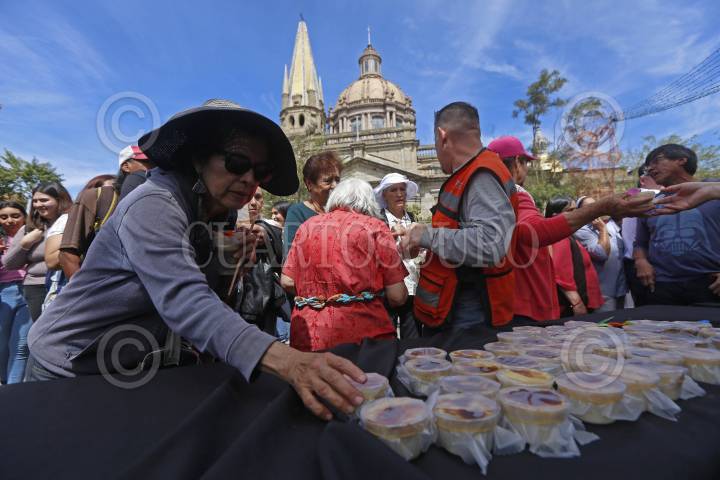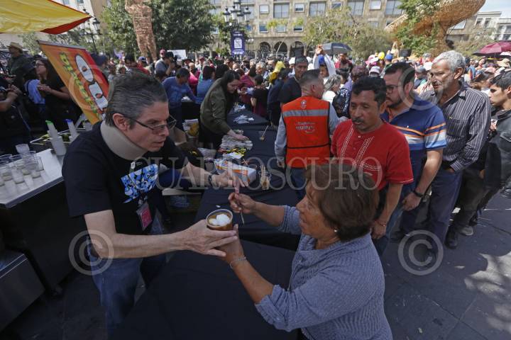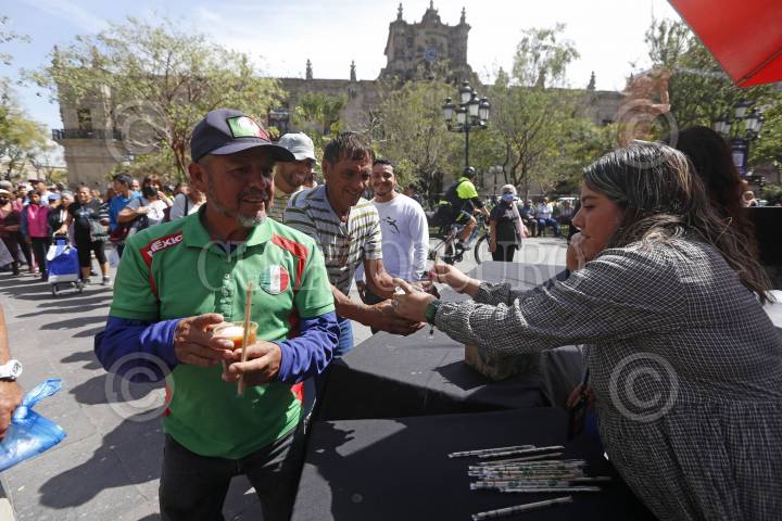 Asistentes a los festejos del 481 aniversario de la fundación de la ciudad, hacen fila para recibir tejuino y jericallas en el centro de la ciudad.