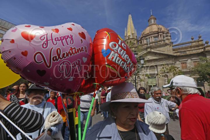 Una mujer de la tercera edad que carga dos globos del dia del amor y la amistad, hace fila para recibir tejuino y jericalla.