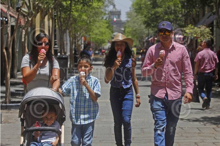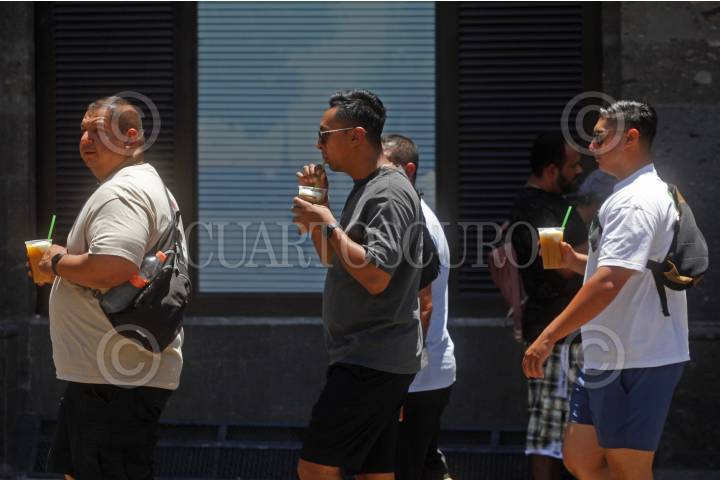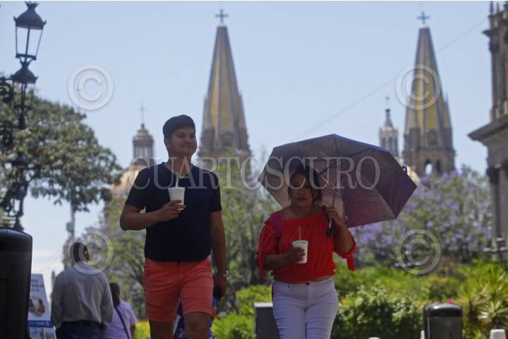 GUADALAJARA, JALISCO, 18ABRIL2024.- La temperaturas altas en la ciudad, obligan a las personas que visitan el centro histórico tapatío a refrescarse con bebidas y a cubrirse de los rayos del sol con sombrillas. FOTO: FERNANDO CARRANZA GARCIA / CUARTOSCURO.COM