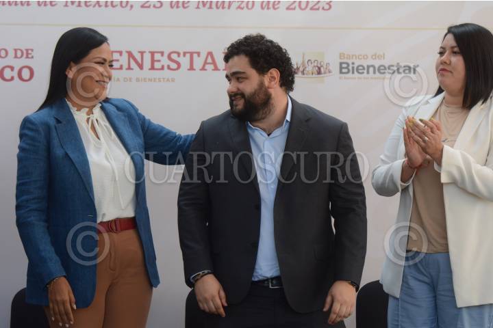 Victor Manuel Lamoyi, director general del Banco del Bienestar; Ariadna Montiel, secretaria del Bienestar, y Juan Pablo de Botton, subsecretario de egresos de la Secretaría de Hacienda y Crédito Público (SHCP), durante la inauguración de la sucursal del Banco de Bienestar en avenida Constituyentes 1001, y la Asamblea de Conformación de Comités de Programas para el Bienestar.