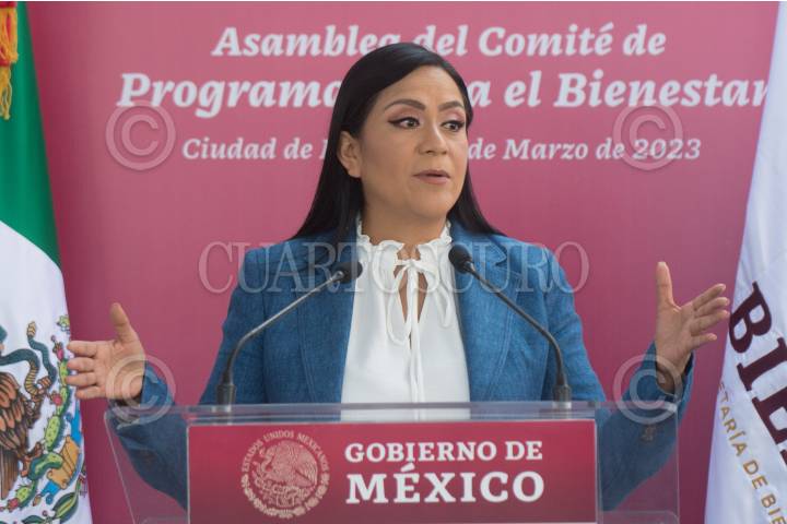 Ariadna Montiel, secretaria del Bienestar, durante la inauguración de la sucursal del Banco de Bienestar en avenida Constituyentes 1001, y la Asamblea de Conformación de Comités de Programas para el Bienestar.