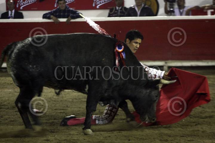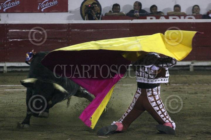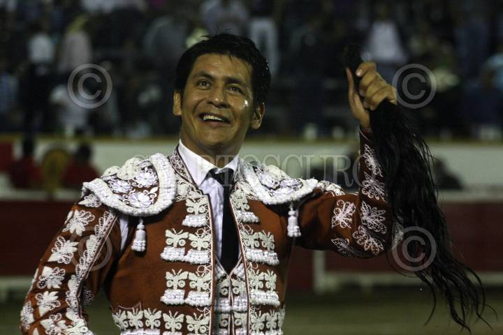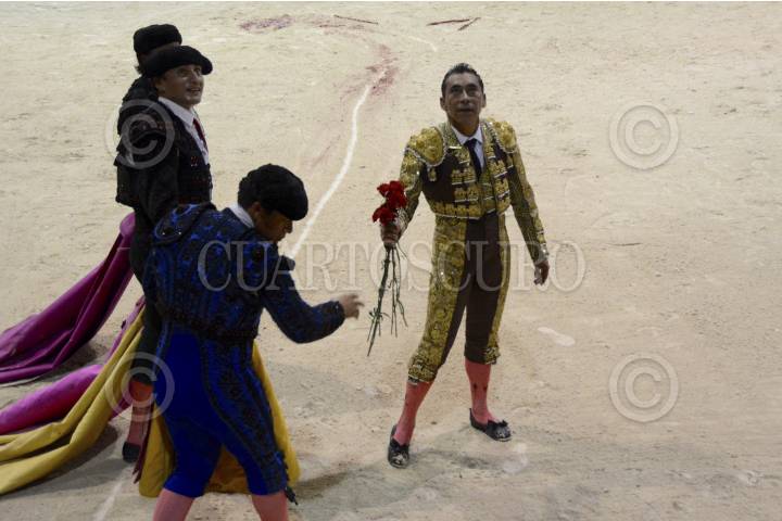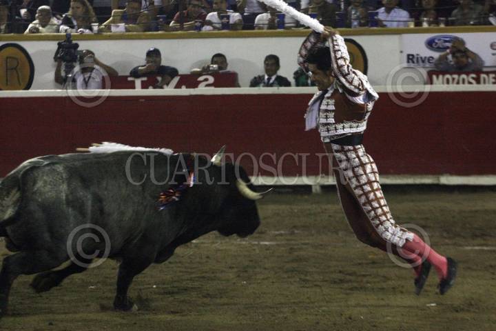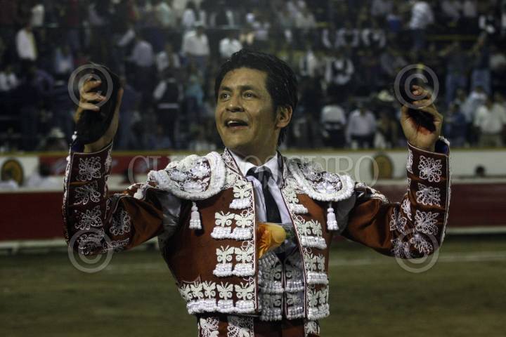 PUEBLA, PUEBLA, 05MAYO2011.- Uriel Moreno "El Zapata", indultó al toro San Juanero, astado de 492 kilogramos de la ganadería Campo Real. Tras una gran faena, el zapata fue el ganador de la noche tras llevarse un rabo y dos orejas en la plaza de toros El Relicario. FOTO: FRANCISCO GUASCO/CUARTOSCURO.COM