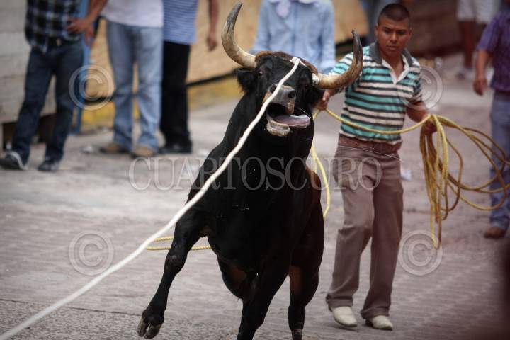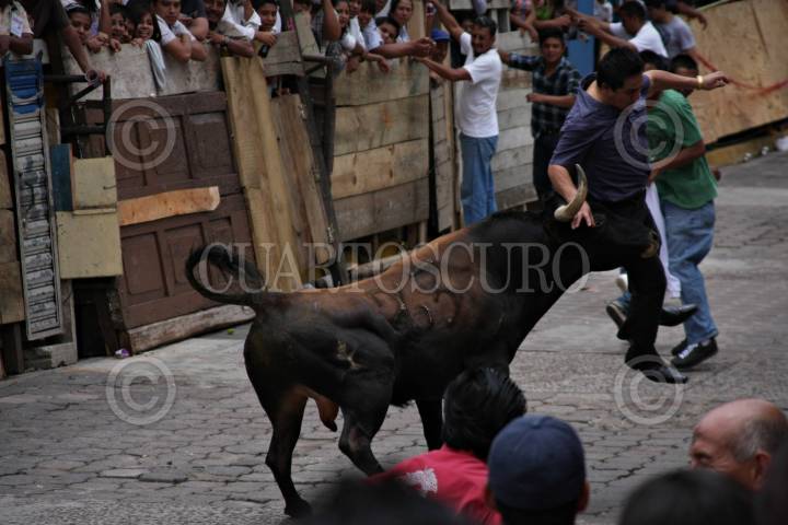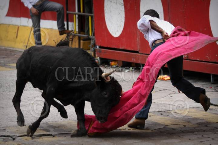 XICO, VERACRUZ, 22JULIO2011.- Este día se llevó a cabo la tradicional Xiqueñada, en donde valientes ciudadanos salieron a la calle principal a torear y corretear 6 bestias de lidia, mientras que cientos de personas observaron desde la baranda en el marco de las fiestas patronales de la Virgen María Magdalena. Autoridades informaron que cuatro personas resultaron lesionadas. FOTO: FÉLIX MÁRQUEZ/CUARTOSCURO.COM