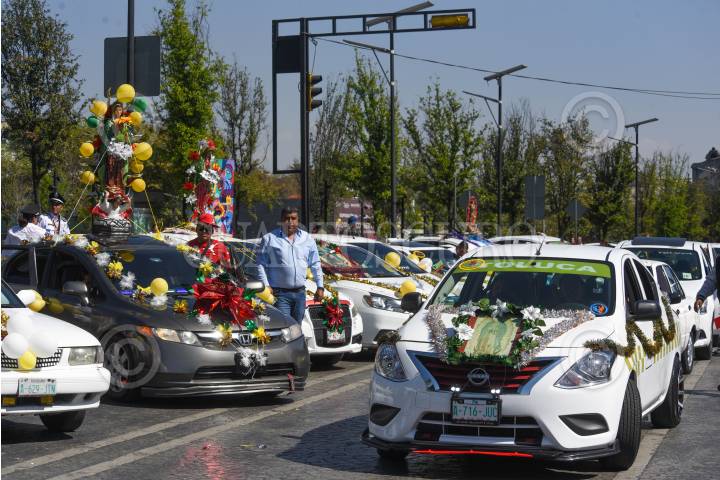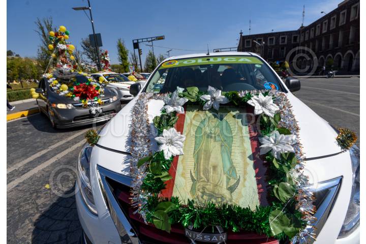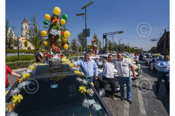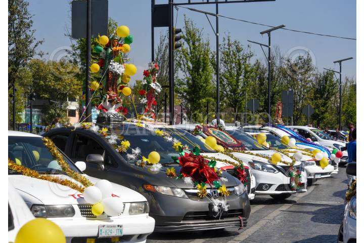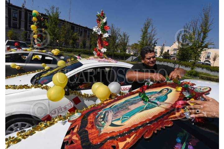 TOLUCA, ESTADO DE MÉXICO, 11DICIEMBRE2024.- Taxistas de San Antonio Buenavista iniciaron los festejos de la Virgen de Guadalupe con una misa en el centro de Toluca, sus unidades estacionadas sobre la avenida Sebastián Lerdo de Tejada fueron adornadas con la imagen de la virgen morena, escarcha de colores, globos, flores y moños, posteriormente iniciarían un recorrido hasta su base para poder compartir de una comida. FOTO: CRISANTA ESPINOSA AGUILAR /CUARTOSCURO.COM