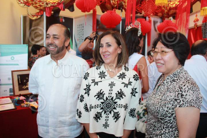 SAN LUIS POTOSÍ, SAN LUIS POTOSÍ, 06AGOSTO2017.- Durante la inauguración de la Feria Nacional Potosina (FENAPO) 2017 se contó con la presencia del embajador de China en México Qiu Xiaoqi, país invitado en el marco de la celebración de 45 años de relaciones diplomáticas con México. En la imágen el senador Teófilo Torres Corzo, Lerena Valle de Carreras y Liu Min. FOTO: MARCELO PALACIOS /CUARTOSCURO.COM