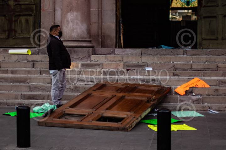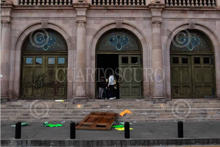 Cerca de cien mineros que aseguraron formar parte del Sindicato Nacional Minero Metalúrgico El Frente, provocaron destrozos y arrancaron una de las puertas principales del Teatro Fernando Calderón, al enfrentarse con otro grupo cercano al sindicato del senador Napoleón Gómez Urrutia, previo a la presentación de su libro "El triunfo de la dignidad.