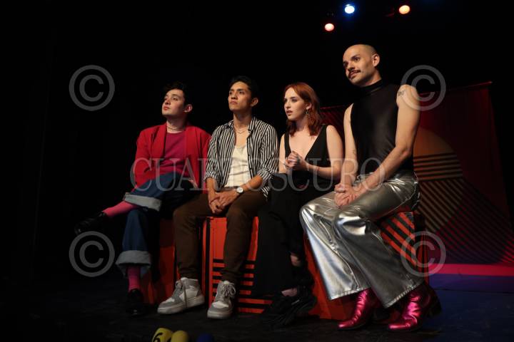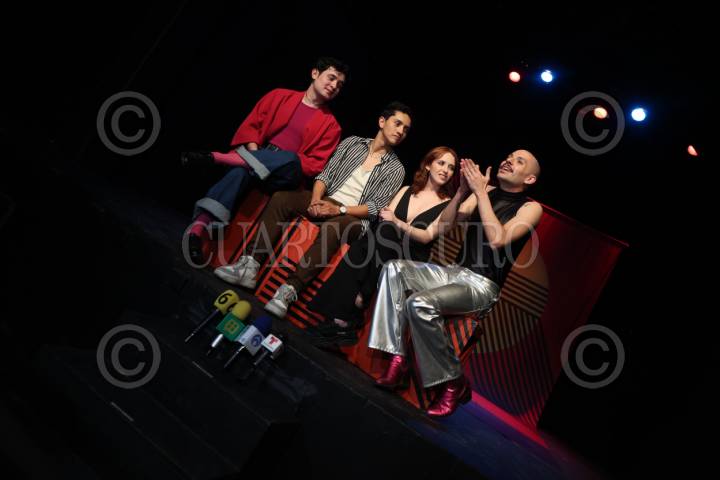 CIUDAD DE MÉXICO, 07FEBRERO2024. Clemente Vega, Saúl Villa, Elizabetha Gruener y Leonardo Bono durante la conferencia de prensa de la puesta en escena “Una disculpa a Lady Gaga”, en el Teatro La Capilla. FOTO: EDGAR NEGRETE LIRA/CUARTOSCURO.COM