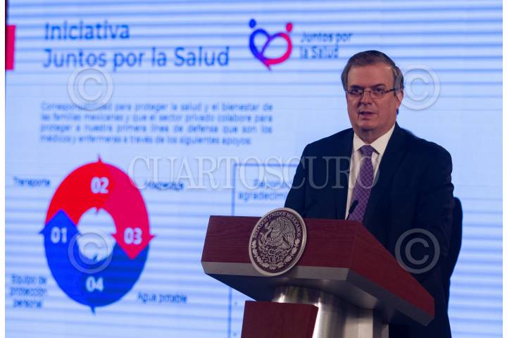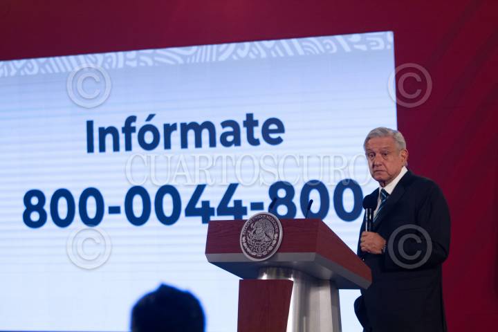 Andrés Manuel López Obrador, presidente de México, acompañado de Marcelo Ebrard Cassubon, Jorge Carlos Alcocer Varela, Hugo López Gatell Ramírez, Martha Delgado Peralta, Héctor Valle Mesto, Germana Fajardo Dolci, Guillermo Torre Amione, Eduardo Osuna Osuna, durante la conferencia matutina en el Palacio Nacional.