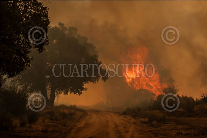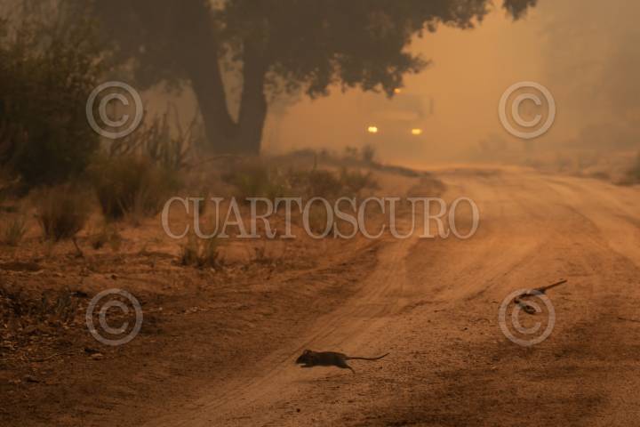 TECATE, BAJA CALIFORNIA, 21JUNIO2025.-Una rata corre en sentido contrario de las fuertes llamas del incendio forestal que avanza rápidamente en la zona del ejido Guadalara en Tecate, Baja California. Desde el lunes 16 de junio, Tecate enfrenta incendios forestales que han persistido por 6 días, afectando más de 2 mil hectáreas. Dos puntos principales siguen activos: uno en la zona de Rosa de Castilla, originado en EE. UU. que cruzó hacia el Cañón Joe Bill y Rancho Ojai, y otro en el Ejido Guadalajara, considerado el más agresivo. Más de 300 bomberos de distintos municipios y personal de CAL FIRE y CONAFOR combaten el fuego, que está contenido entre un 20 y 50%. El Ejército Mexicano también participa con el Plan DN-III. FOTO: OMAR MARTÍNEZ / CUARTOSCURO.COM