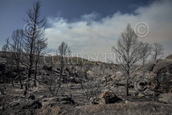 TECATE, BAJA CALIFORNIA, 29JUNIO2025.-Árboles incendiados en ejido Gustavo Auvanel Vallejo. Desde el 16 de junio, incendios forestales en Tecate han arrasado más de 12 mil hectáreas, destruyendo viviendas y afectando la flora, fauna y calidad del aire. Con un 70?control, el fuego sigue activo en zonas como La Rumorosa, donde se mantiene la prealerta de evacuación. Más de 200 elementos de emergencia trabajan en la contención. FOTO KAREN CASTAÑEDA/CUARTOSCURO.COM