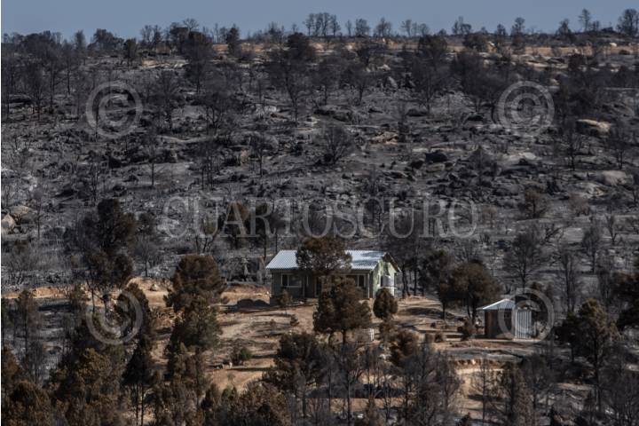 TECATE, BAJA CALIFORNIA, 29JUNIO2025.- Una casa logra salvarse del incendio forestal, quedando en medio de decenas de árboles calcinados por el fuego. Desde el 16 de junio, incendios forestales en Tecate han arrasado más de 12 mil hectáreas, destruyendo viviendas y afectando la flora, fauna y calidad del aire. Con un 70?control, el fuego sigue activo en zonas como La Rumorosa, donde se mantiene la prealerta de evacuación. Más de 200 elementos de emergencia trabajan en la contención. FOTO KAREN CASTAÑEDA/CUARTOSCURO.COM