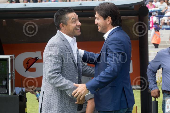 CIUDAD DE MÉXICO, 24FEBRERO2019.- Los técnicos Ignacio Ambríz (León) y Bruno Marioni (Pumas) se saludan previo al encuebtro que sus equipos disputaron en el Estadio Olímpico. Los visitantes lograron una contundente victoria de 3-1. FOTO: MOISÉS PABLO /CUARTOSCURO.COM