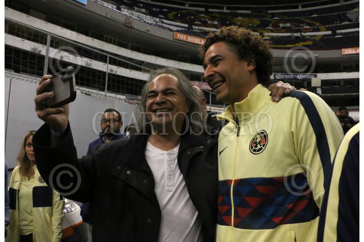 Adolfo Díaz "Rufo", periodista y Guillermo Ochoa, portero del Club America, durante el "Día de Medios", previo al partido de vuelta de la final de la Liga MX entre las Águilas del América y los Rayados del Monterrey la cual se disputará en el Estadio Azteca.
