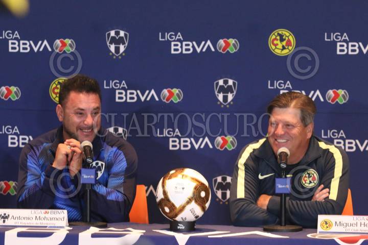 Antonio el "Turco" Mohamed, técnico del Club Monterrey y Miguel Herrera, técnico del Club America, durante la conferencia de prensa en el Día de Medios previo al partido de vuelta de la final de la Liga MX entre las Águilas del América y los Rayados del Monterrey la cual se disputará en el Estadio Azteca.