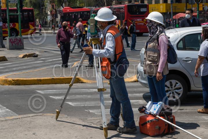 Topógrafos laboran en avenida Insurgentes y Eje 1 Norte.