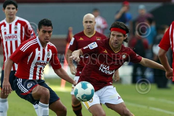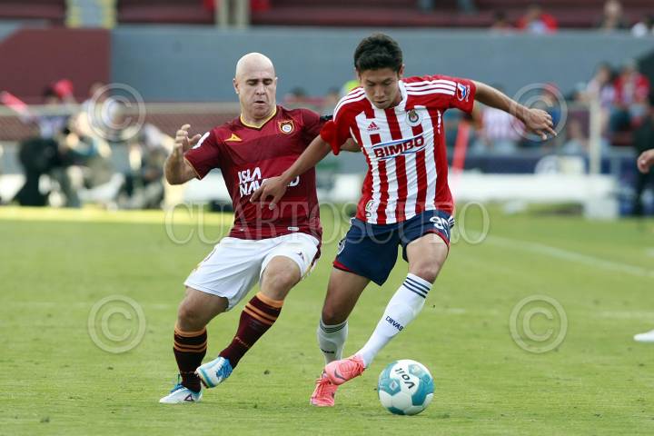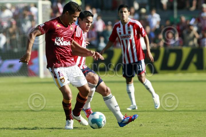 ZAPOPAN, JALISCO, 04FEBRERO2014.- Esta noche en el Estadio Omnilife y en partido correspondiente a la Jornada 3 de la Copa MX 2014, se enfrentan los equipos de las Chivas de Guadalajara frente al conjunto de Estudiantes Tecos, en donde el marcador favoreció al equipo visitante 2-1. En la imagen el jugador del Guadalajara Eduardo López, disputa el balón frente al Jugador de Estudiantes Tecos, Christian Sánchez. FOTO: FERNANDO CARRANZA GARCIA/CUARTOSCURO.COM