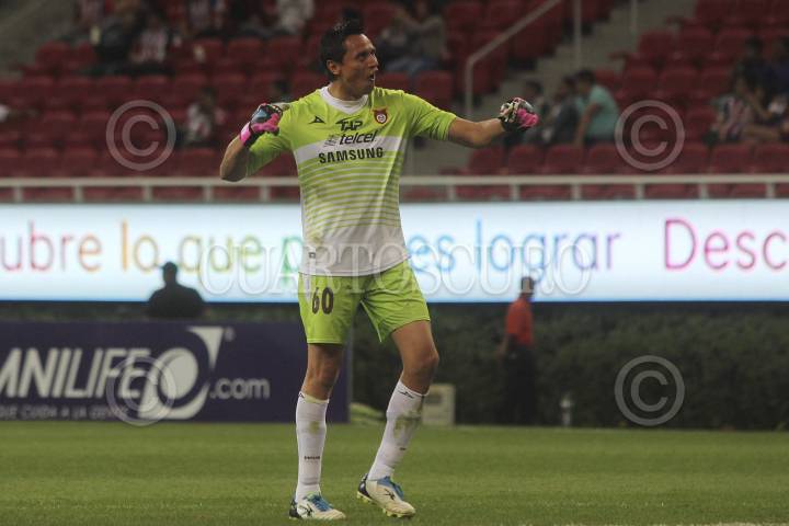 ZAPOPAN, JALISCO, 04FEBRERO2014.- Esta noche en el Estadio Omnilife y en partido correspondiente a la Jornada 3 de la Copa MX 2014, se enfrentan los equipos de las Chivas de Guadalajara frente al conjunto de Estudiantes Tecos, en donde el marcador favoreció al equipo visitante 2-1. En la imagen el guardameta de Estudiantes Tecos Guadalupe Martínez, celebra una de las anotaciones que logro su equipo. FOTO: FERNANDO CARRANZA GARCÍA /CUARTOSCURO.COM