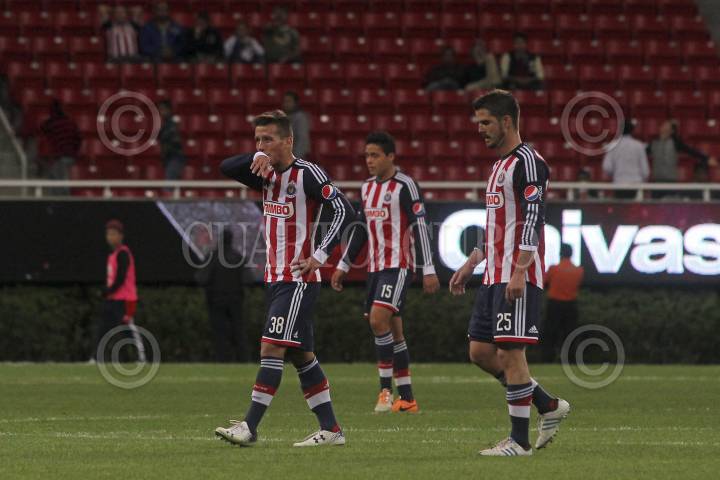 ZAPOPAN, JALISCO, 04FEBRERO2014.- Esta noche en el Estadio Omnilife y en partido correspondiente a la Jornada 3 de la Copa MX 2014, se enfrentan los equipos de las Chivas de Guadalajara frente al conjunto de Estudiantes Tecos, en donde el marcador favoreció al equipo visitante 2-1. En la imagen jugadores del equipo del Guadalajara salen inconformes con el resultado de esta noche. FOTO: FERNANDO CARRANZA GARCIA/CUARTOSCURO.COM